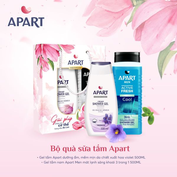 Bộ quà Sữa tắm sảng khoái Apart là sự kết hợp hoàn hảo giữa hai dòng sản phẩm sữa tắm cao cấp, giúp chăm sóc và dưỡng ẩm làn da từ sâu bên trong. Bộ quà này gồm hai sản phẩm: Gel tắm Apart dưỡng ẩm, mềm mịn da chiết xuất hoa violet và Gel tắm nam Apart Men mát lạnh sảng khoái 3 trong 1. Cả hai sản phẩm đều có công thức đặc biệt giúp làm sạch sâu, duy trì độ ẩm và mang lại cảm giác sảng khoái cho người sử dụng.