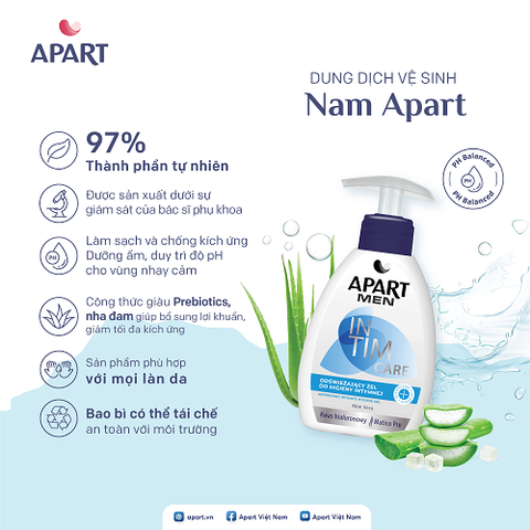 Dung dịch vệ sinh nam Apart mang đến sự chăm sóc an toàn và hiệu quả cho vùng kín của nam giới. Nhờ sử dụng các hoạt chất chất lượng cao chứa prebiotic làm dịu da, sản phẩm giúp làm sạch và chống kích ứng. Mang lại cảm giác sảng khoái và sạch sẽ lâu dài.
