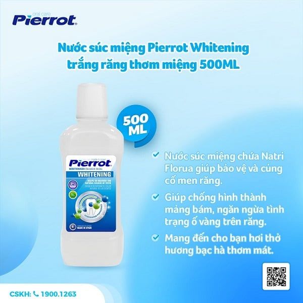 Bên cạnh việc đánh răng hằng ngày, sử dụng nước súc miệng là bước quan trọng giúp hoàn thiện chu trình chăm sóc răng miệng và bảo vệ sức khỏe khoang miệng toàn diện. Nước súc miệng Pierrot Whitening trắng răng thơm miệng 500ML là sản phẩm được nhiều người tin dùng nhờ khả năng làm sạch sâu, hỗ trợ trắng răng và mang lại hơi thở thơm mát dài lâu. Với công thức chứa Natri Fluorua cùng chiết xuất bạc hà, sản phẩm giúp ngăn ngừa mảng bám, bảo vệ men răng và nâng cao sức khỏe răng miệng mỗi ngày.