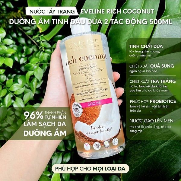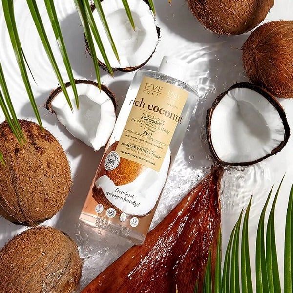 Nước tẩy trang Eveline Rich Coconut chiết xuất tinh dầu dừa 96% thành phần thiên nhiên, 2 tác động giúp loại bỏ lớp bụi bẩn, trang điểm không trôi trong nước một cách nhẹ nhàng mà không cần phải chà xát mạnh. Đặc biệt, nước tẩy trang còn cung cấp các dưỡng chất dưỡng ẩm vượt trội, chăm da khỏe từ sâu bên trong. Đây là một trong những sản phẩm hoàn hảo cho mọi loại da.
