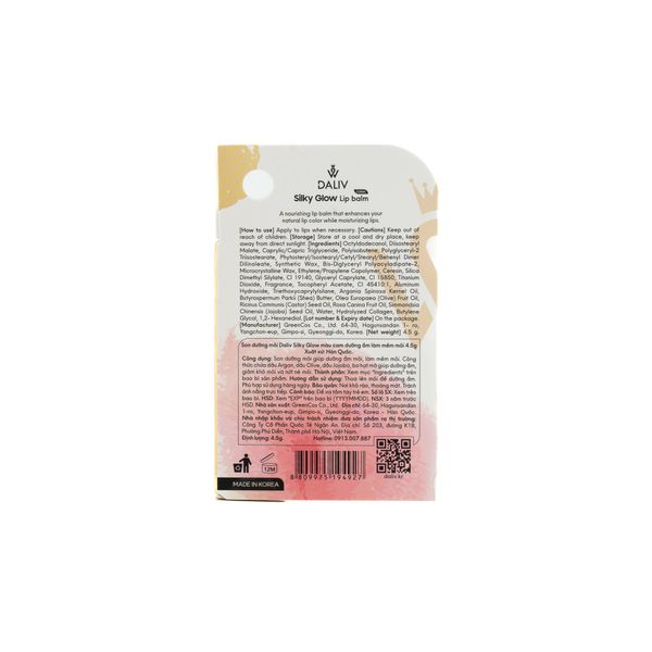 Son dưỡng môi Daliv Silky Glow màu cam dưỡng ẩm làm mềm môi 4.5g giúp dưỡng ẩm môi, làm mềm môi, cho môi luôn mềm mại. Công thức chứa dầu Argan, dầu Olive, dầu Jojoba, bơ hạt mỡ giúp dưỡng ẩm, giảm khô môi và nứt nẻ môi.