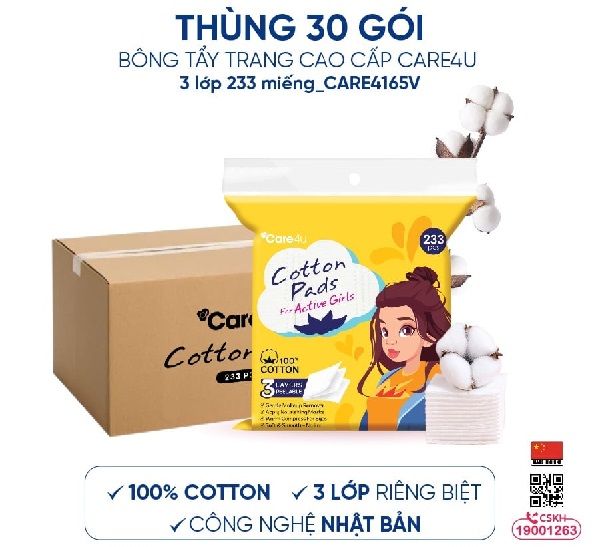 Sản phẩm được đóng gói theo thùng gồm 30 gói, mỗi gói chứa 233 miếng bông tẩy trang, mang đến tổng số lượng lớn cho quá trình sử dụng liên tục. Hình thức đóng thùng giúp giảm chi phí trên từng gói, đồng thời hỗ trợ việc bảo quản, sắp xếp và vận chuyển trở nên gọn gàng, khoa học hơn.