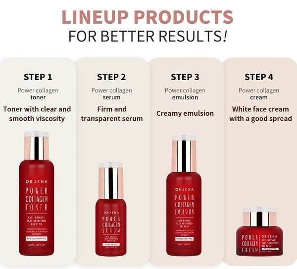 Nằm trong bộ sưu tập Power Collagen, tinh chất Orjena đóng vai trò trung tâm, giúp tăng cường hiệu quả của các bước skincare tiếp theo như sữa dưỡng và kem dưỡng.